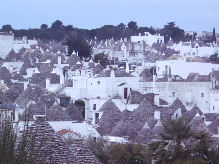 Альберобелло внесен в список всемирного наследия ЮНЕСКО, так как здесь на большой площади сохранилась застройка в стиле трулло (множ.ч. - трулли) - забавные здания с крышами конической формы, чем-то напоминающие по форме конфеты трюфели. Долина Итрия, посреди которой стоит город, живописна и сама по себе (особенно хороши серо-зеленые оливковые рощицы), но более всего здесь привлекают внимание эти самые трулли. По мере приближения к цели, сначала мы пытались фотографировать из окна вагона каждый трулло, потом только самые интересные их группки, но дальше их концентрация увеличилась настолько, что мы бросили это занятие.