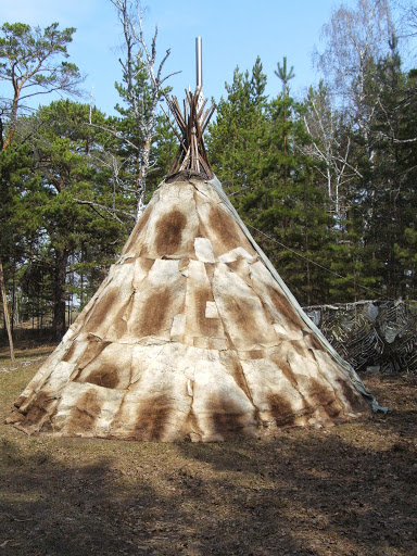 Это зимний чум, покрытый оленьими шкурами. Из него торчит печная труба (это более продвинутый вариант, по сравнению с костром на полу).