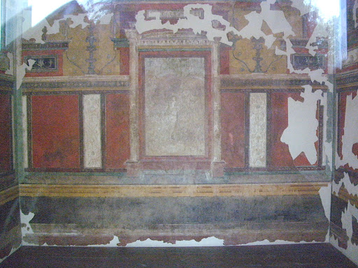 Неподалеку от дома императора расположен дом Ливии, который обычно закрыт, но в этом году его на некоторое время открыли для посещения. Росписи дома Ливии дошли до нас не в таком хорошем состоянии, но, тем не менее, в полутемном помещении можно разглядеть геометрические и растительные узоры, и даже пару мифологических сцен (на фотографиях все это, правда, выглядит еще невнятнее, чем в жизни, - со вспышкой фотографировать здесь, как и во всех других музеях и церквях, нельзя).