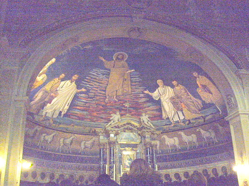 Покинув Палатин, отправились к Капитолию по улице Фори Империале - мимо грандиозных развалин Императорских форумов, построенных в тот период, когда республиканский форум перестал справляться с ролью центра имперской жизни. По дороге зашли в церковь Санти-Козма-э-Дамиано - типичную римскую базилику с яркой апсидной мозаикой VI века. Надо сказать, что это была первая увиденная нами римская церковь - оттого впечатление от нее осталось очень сильным.