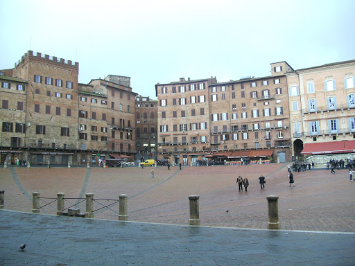 Этим, собственно, и объясняется архитектурное великолепие города - желание не ударить в грязь лицом перед соперником, ну и возможности у населения были: сиенские банкиры обладали немалыми состояниями. Немного поплутав по средневекового вида улицам (внутри оборонительных стен облик города практически не изменился с XIII-XIV веков!), добрались до первой достопримечательности - великолепной площади Кампо, немного напоминающей по форме амфитеатр вокруг палаццо Публико (1310г), служившего резиденцией т.н. Совету девяти - органу управления средневековой Сиены. О Совете напоминает также тот факт, что площадь, вымощенная разноцветным травертином, разделена на 9 секторов.