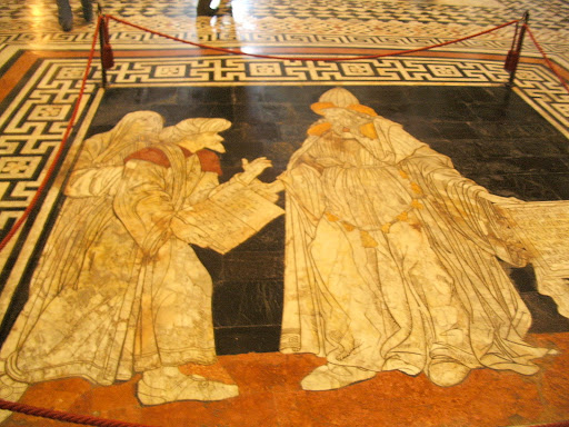 Не меньше впечатляет пол собора, украшенный мраморными мозаиками в стилях "граффито" и "коммессо", который Вазари называл самым чудесным полом из всех существующих - уверена, он не сильно преувеличил. Эскизы мозаик принадлежат мастерам, расписывавшим собор, создавались они на протяжении нескольких веков - а завершен был пол, как я и писала выше, только в XIX веке.