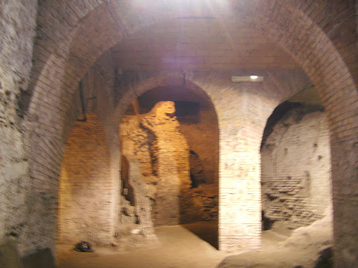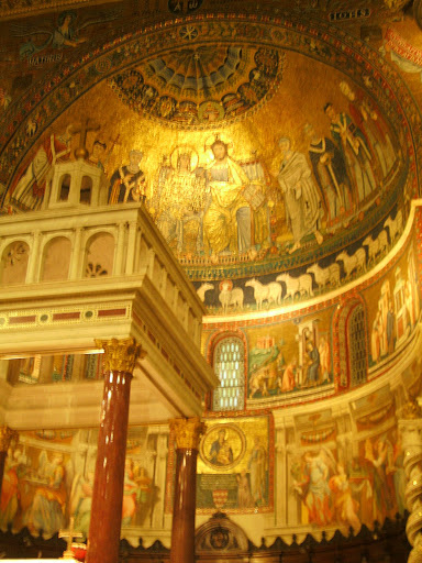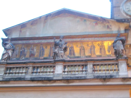 Напоследок успели еще зайти в интереснейшую церковь Сан-Кризогоно (IVв, по примеру большинства римских церквей перестроена в XII и XVI веках). Самое интересное здесь даже не апсида XVII века, украшенная не фресками, а позолоченными барельефами, а раскоп нижней базилики, где мы погуляли некоторое время в попытках разглядеть полустертые фрески VIII века. Почему-то именно такие места (а их в Риме там немало встречается), где слои истории накладываются друг на друга, вызывали у меня особенно сильные чувства.