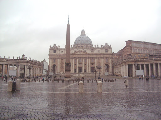 Переведя дух ("Все-таки помирать теперь не так страшно будет"- отшутилась ОВ, которой, уверена, предстоит еще много лет жизни в полном здравии), прямиком пошли в собор Святого Петра. Здесь посмотрели на чудесную "Пьету" раннего Микеланджело, барочные берниниевские интерьеры (балдахин и несколько надгробий), зашли в сакристию, где расположен музей-сокровищница и, несколько разочаровавшись, несмотря на грандиозные размеры собора, вышли на площадь святого Петра. Как известно, на этом месте до XVI века стояла базилика, возведенная еще при Константине Великом над могилой Святого Петра в IV веке нашей эры, но потом из соображений престижа ее решили заменить нынешним сооружением (и совершенно напрасно, по-моему). Читала, что под полом здесь раскопан античный раннехристианский некрополь, а также есть музей с артефактами старой базилики, но в этот раз мы туда не попали.