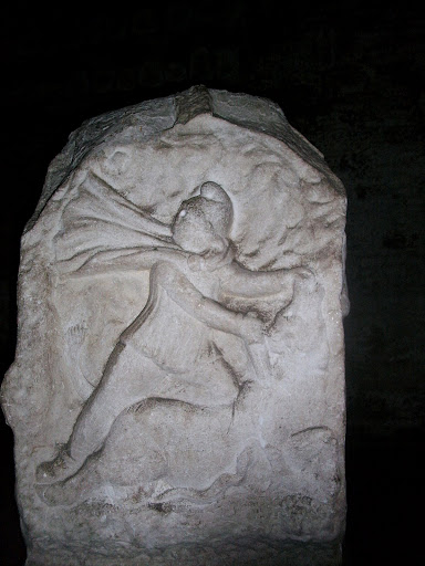 Спустившись в митраитское святилище II века н.э. и примыкающее к нему римское казначейство I в н.э., обнаружили среди слабо освещенных коридоров под невысокими сводами алтарь с высеченным на нем Митрой, убивающим быка. Этот акт насилия, по верованиям митраитов, ознаменовал начало жизни на земле, но ее источник - кровь и семя священного животного налетели также и темные силы: их можно наблюдать на рельефе: собака кусает быка за ногу, змея слизывает кровь, а скорпион впился несчастной жертве в причинное место.