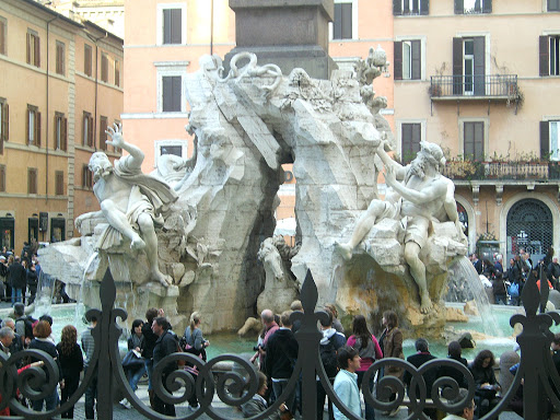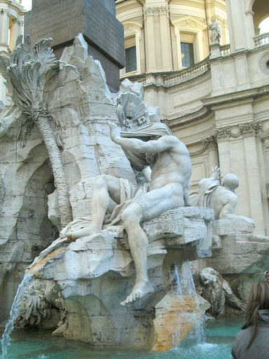 Бернини. Фонтан и вправду великолепен - один из лучших в Риме, украшен аллегориями крупнейших рек 4-х континентов: Нил, Ганг, Дунай и Ла-Плата (Амазонку тогда еще не открыли).