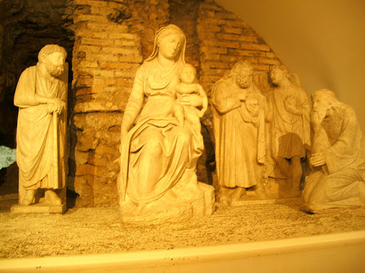 История ее строительства такова: построена в IV веке, перестроена в XIII и XVIII веках. Внутри можно найти интересного: от тончайшей работы апсидных мозаик V века, несколько подправленных в XIII веке, росписей Гвидо Рени и Кавалера Д'Арпино до отличных средневековых мозаик на фасаде церкви, которые можно посмотреть, поднявшись на балкон (чего мы из-за нехватки времени не сделали). В музее при соборе (т.н. Опера) можно увидеть один из первых вертепов VII века, который, правда, сильно переделан в 1289 году Арнольфо ди Камбио.
