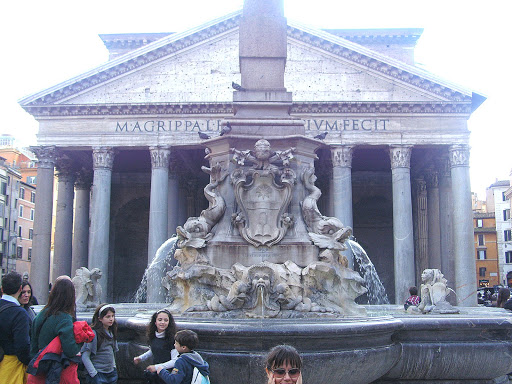 Со стороны тесной и запруженной народом площади Ротонды с очередным римским фонтаном 1575 года можно совершенно свободно (не считая, конечно, обычных туристических толп) попасть в Пантеон - грандиозный храм, выстроенный во II веке н.э. императором Адрианом (вернее, переделанный из храма всех Богов, построенного Марком Агриппой в 27 г до н.э.). Под тимпаном, поддерживаемым рядом мощных коринфских колонн, осталась надпись : М.AGRIPPA L.F.COS TERTIUM FECIT ("Марк Агриппа, сын Луция, трижды консул, сделал"). В христианскую эпоху в VII веке Пантеон стал церковью, а позже - местом захоронения избранных итальянских селебритиз. Правда, в XIX веке большую часть захоронений убрали, но могилы первых королей независимой Италии и гробницу Рафаэля можно здесь увидеть и сейчас.