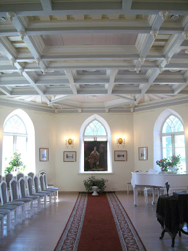 На противоположном от дворца берегу Белого озера на небольшой мысу у самой воды стоит павильон Венеры, выстроенный по образцу павильона в имении принца Конде Шантийи, которое Павел и Мария Федоровна посещали во время своего большого путешествия по Европе. Снаружи сооружение малопримечательное, но внутри поразительное - с трех сторон павильон окружен водой и три огромных окна во всю стену смотрят на озеро. Интерьер также довольно симпатичный - классический во вкусе Марии Федоровны: с неизменно хорошим паркетом и огромным расписным плафоном.