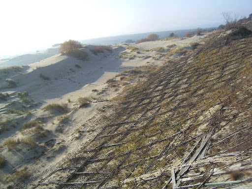 Сам процесс продолжающегося и поныне облесения дюн также можно наблюдать здесь: в песок забиваются деревянные колышки, между ними укладывается сетка из каких-то прутьев, в ячейки которой высаживаются специальные растения с развитой корневой системой. Прорастая, их корни переплетаются между собой и образуют своеобразный каркас дюны. Когда ветер наносит новый слой песка, процедура повторяется. Так что необлесенные дюны на Куршской косе сейчас можно наблюдать только у берегов залива.