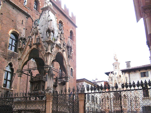 Недалеко от площади деи Синьори находится небольшая церковь Санта-Мария Антика, а рядом с ней впечатляющий комплекс построек готического стиля: несколько гробниц правителей города из рода Скалигеров. Калитка в ограде (которая тоже с XIV века сохранилась), оказалась почему-то заперта (как и сама церковь), но гробницы были довольно хорошо видны сквозь ажурную решетку. Высокие постаменты, увенчанные надгробными скульптурами под островерхими рыцарскими шатрами, смотрятся мрачно и величественно - это вам не светлая и разумная ренессансная архитектура Саммикели.