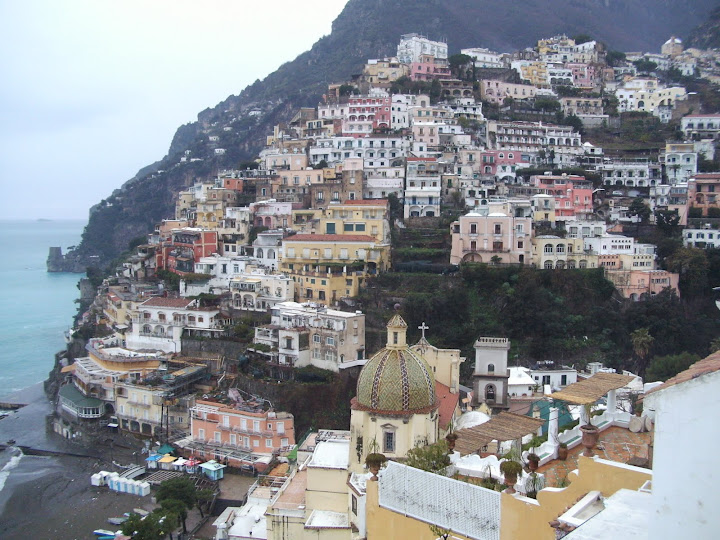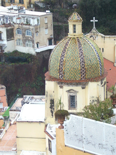 Последним, что мы посетили на побережье, был городок Позитано, известный не столько своими достопримечательностями, сколько как место, где в более урочное время года курортная дольче вита достигает своего апогея. По понятным причинам, под дождем никакой дольче виты мы здесь не вкусили, только прогулялись немного по улице, ведущей к красивой церкви Санта-Мария Ассунта XIIIв, увенчанной желто-зеленым майоликовым куполом и декорированной в стиле барокко в XVI-XVIIвв, сделали несколько фото: Позитано, несмотря ни на какие капризы погоды, одно из самых фотогеничных мест и без того фотогеничного Амальфитанского побережья (причем, фотогеничного настолько, что, просматривая чужие фотографии этих мест в Интернете, я даже порадовалась дождю и дымке, сопровождавшим нас весь день, - они, конечно, подпортили качество фотографий, но лишили их слишком уж откровенной открыточности).