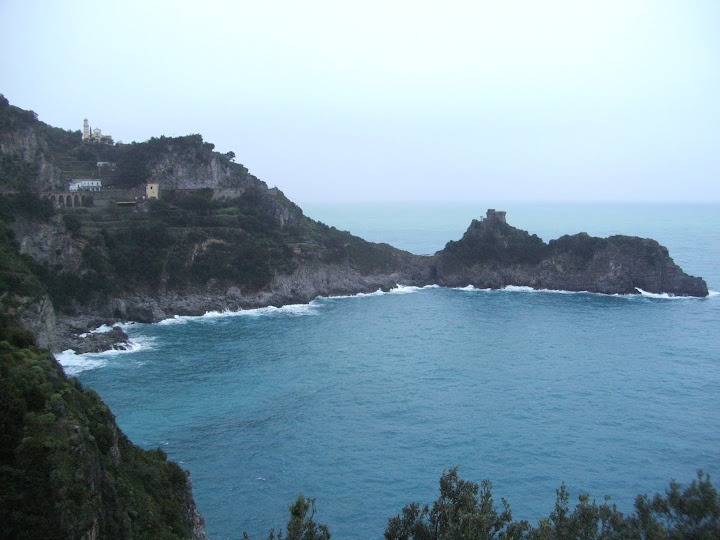 Мыс Соттиле (т.е. Тонкий мыс) с башней Градо (1568г). Побережье Амальфи изобилует такими вот заливчиками и бухточками, которые и не позволяют проложить вдоль него нормальную прямую дорогу.