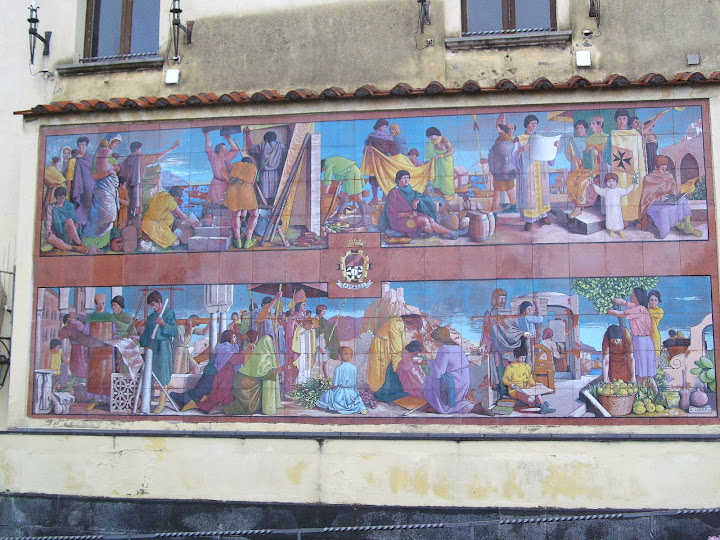 Майоликовые таблички на здании Муниципалитета, иллюстрирующие историю Амальфи.