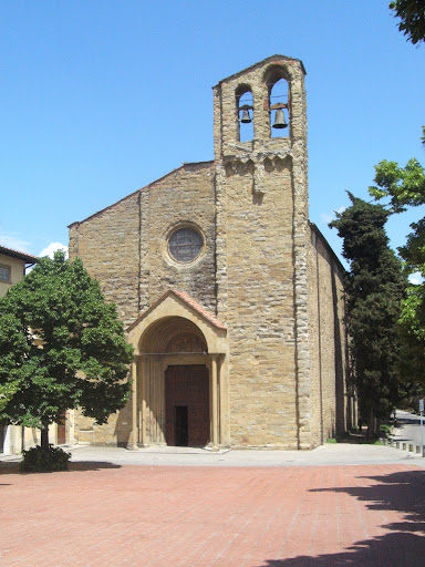 Апсидой церковь выходит на красивую площадь Гранде, расположенную под уклоном (в гайд-буках пишут, что перепад высот здесь до 10 метров, но визуально кажется, что все-таки поменьше). Здесь также сохранился колодец XVв, палаццо делле Лодже, спроектированной Джорджо Вазари (Вазари в Ареццо вообще много - он местный уроженец и довольно часто бывал в родном городе), жилые дома XII-XIVвв, а также замечательное палаццо Фратернита дей Лаичи, увенчанное башней с часами.