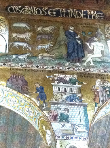 Норманнский дворец – огромный комплекс разновременных построек (кстати, на этом месте, как пишут путеводители, находилась арабская крепость, возможно, она и стала основой для дворца). Палатинская капелла, возведенная вместе с королевскими покоями между 1130 и 1140гг, составляет его главную туристическую приманку. Капелла невелика, но вся покрыта великолепными мозаиками работы греческих мастеров. Здесь также потрясающий деревянный потолок, выполненный арабскими резчиками в стиле мукарнас, и даже расписанный сценами из придворной жизни (что все-таки является отступлением от канонов исламского искусства, но делалось-то все для христианского короля). Этих рисунков из-за высоты не видно, у меня был бинокль, но и он не сильно помог. Хорошо рассмотреть эти рисунки можно лишь в альбоме или в палаццо Зиза, где их копии приведены на стендах.