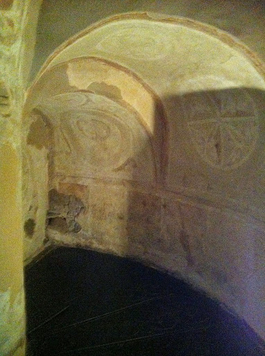 Очень интересные росписи украшают лестницу, ведущую на второй этаж. Здесь также много старых граффити (хотя и в основном объеме храма они тоже встречаются).
