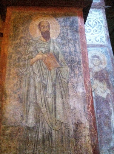 Софийский собор Киева – древнейший из сохранившихся православных храмов на территории бывшего СССР. Строительство начато в 1019 году, росписи и мозаики относятся к первой четверти XIв. Со временем вокруг собора вырос целый комплекс зданий, основная масса которых относится к XVII веку, когда была сильно перестроена и сама София. Так что свой первоначальный облик она утратила (в отличие, например, от Софии новгородской). Зато в Новгороде практически не сохранился древний внутренний декор храма («спасибо» горе-реставраторам XIXв), а вот в Киеве фресок и мозаик XIв и сейчас можно видеть довольно много. Некоторые участки росписи, конечно, поновлялись, но не столь значительные, да и многое потом было расчищено.