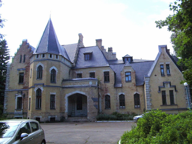 Напоследок по Подушкинскому шоссе доехала до усадьбы Мейендорф (1874г), но сам главный дом, стилизованный под рыцарский замок, мне не удалось увидеть и краем глаза – густая растительность закрывала даже то, что зимой (по словам местных жителей) видно из-за забора. Так что даже отыскать усадьбу сложно, поскольку ее совсем не видно с дороги. О том, чтобы пробраться за территорию (дом принадлежит Управлению делами президента РФ), речи не идет. Доступны лишь боковины бывшего усадебного парка, облюбованные мамашами с колясками и прочими местными жителями.