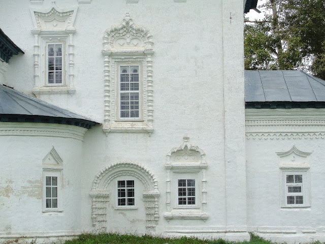 Еще более впечатляющий архитектурный ансамбль находится на бывшей Торговой площади. Он состоит из сооруженного на средства местных купцов Пометяевых храма Рождества Богородицы (1678-1680гг), скромной Никольской церкви (1741г) и Благовещенской церкви (1692-1729гг). Эта последняя – наверное, самая выдающаяся постройка Каргополя. Во всех путеводителях вы прочтете цитату из Игоря Грабаря о том, что ее фасады напоминают флорентийские палаццо, а алтарная стена – вообще шедевр стенной обработки. По мне, так русское узорочье на ренессанс похоже весьма отдаленно (поскольку в нем нарушен основной ренессансный принцип – симметрия), но это ничуть не умаляет достоинств резного декора Благовещенской церкви.