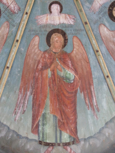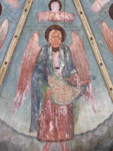 Церковь нам открыл один из местных жителей, следящий за состояние церкви (а оно, насколько я поняла, вызывает тревогу – фундамент дал усадку и геометрии основного объема нарушена). Внутри Владимирской церкви сохранилось «небо» кон.XVIIIв, лучше которого до этих пор мне лично видеть не приходилось. На его гранях изображены традиционные архангелы, но все блондины – изображения такого типа в русской иконографии именуются «златые власы». Но лучше всего, написано, пожалуй, Распятие с предстоящими, особенно фигуры и лики Иоанна Богослова и сотника Лонгина.