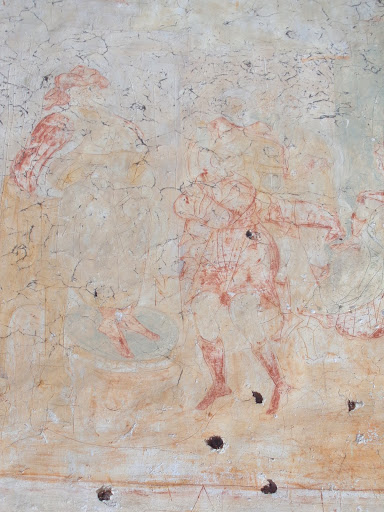 От этой процессии святых остались, в основном, насечки на штукатурке - зато сразу видно технологию фресковой живописи: сначала процарапывали рисунок, а потом наносили краски. В Пизе, кстати, такие рисунки (их там называют синопиями), открывшиеся после гибели фресок кладбища Кампо Санто после американских бомбардировок, сейчас висят в специальном Музее синопий. Считается, что они имеют большую ценность, поскольку точно выполнены рукой мастера, в то время, как расписывать могли и подмастерья.
